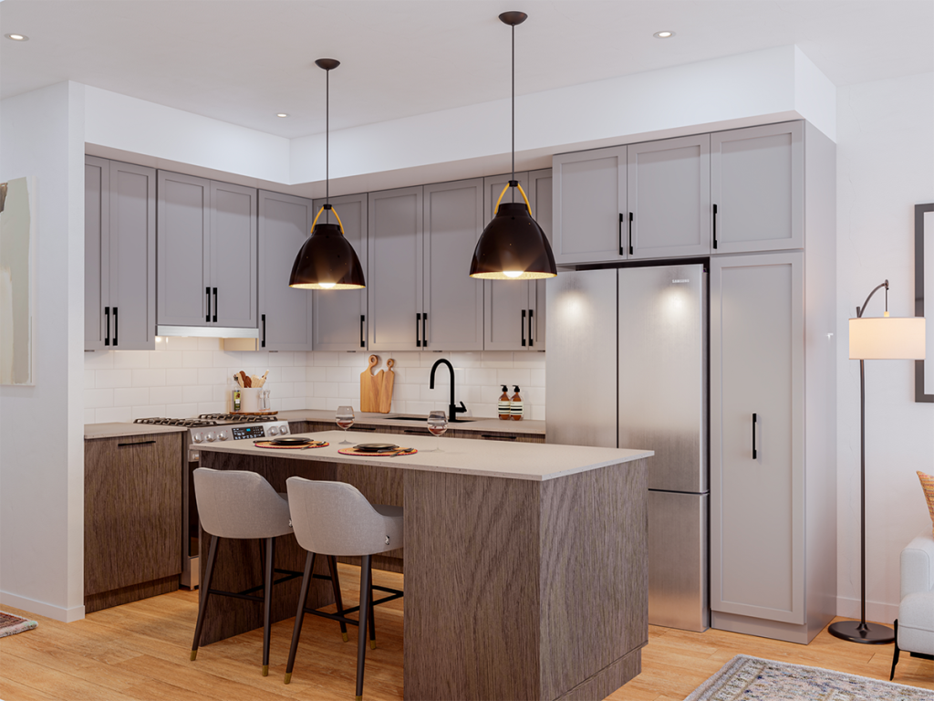 Stylish shaker-style doors Integrated dishwasher Air conditioned homes 7” Wide-plank vinyl flooring